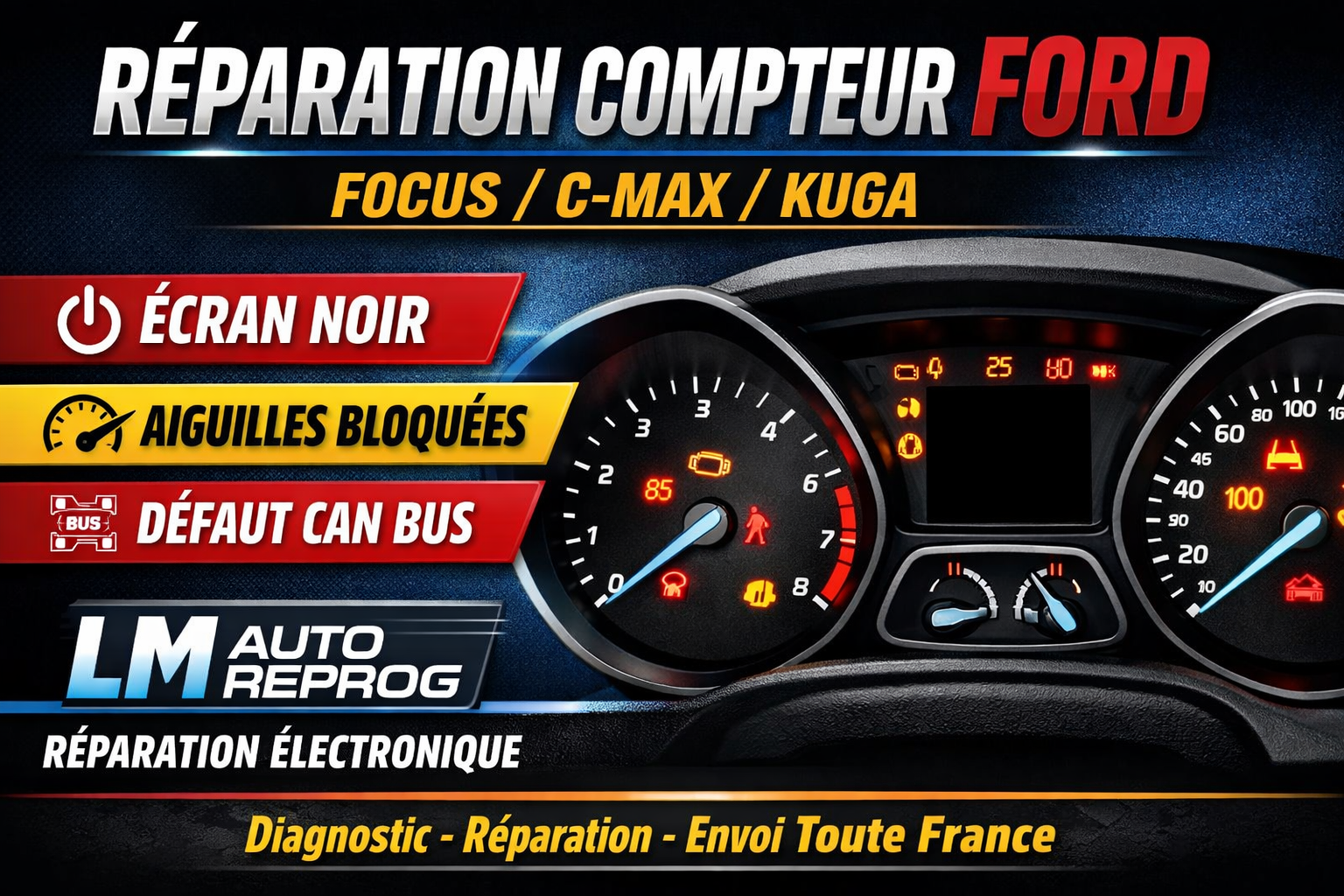 LM Auto Reprog est spécialisé dans la réparation électronique des compteurs Ford Focus, C-Max et Kuga avec traitement des pannes connues sans remplacement inutile.